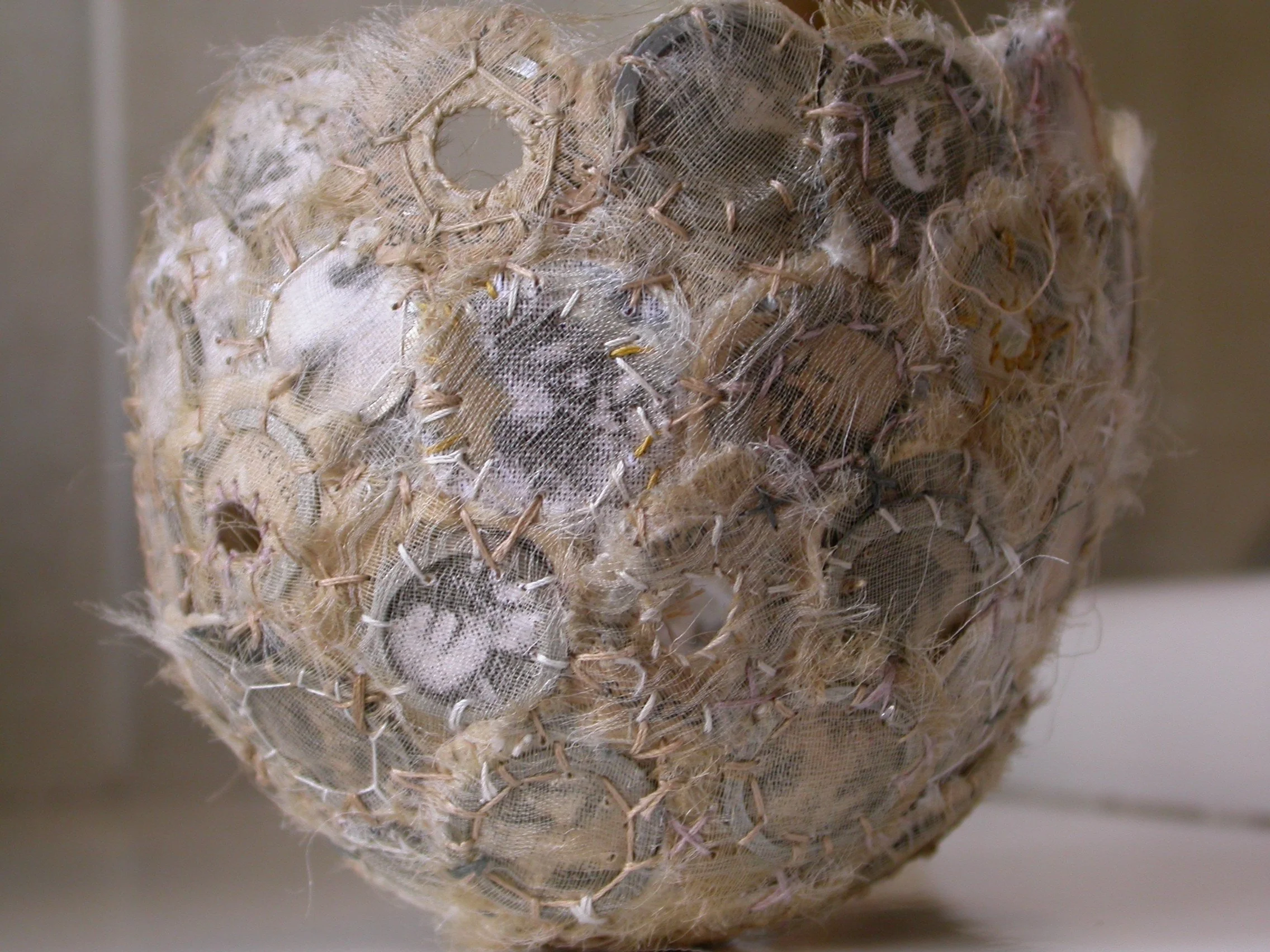 The coccons are intentionally complex and intensely worked forms that seem to be halfway between nests and armor. Made of layers of paper and textile, reinforced with iron discs, they present a large number of stitches; the paper used recalls past memories and experiences. The seriality and repetition of stitching as a means of making sense of something and finding stability and calm.